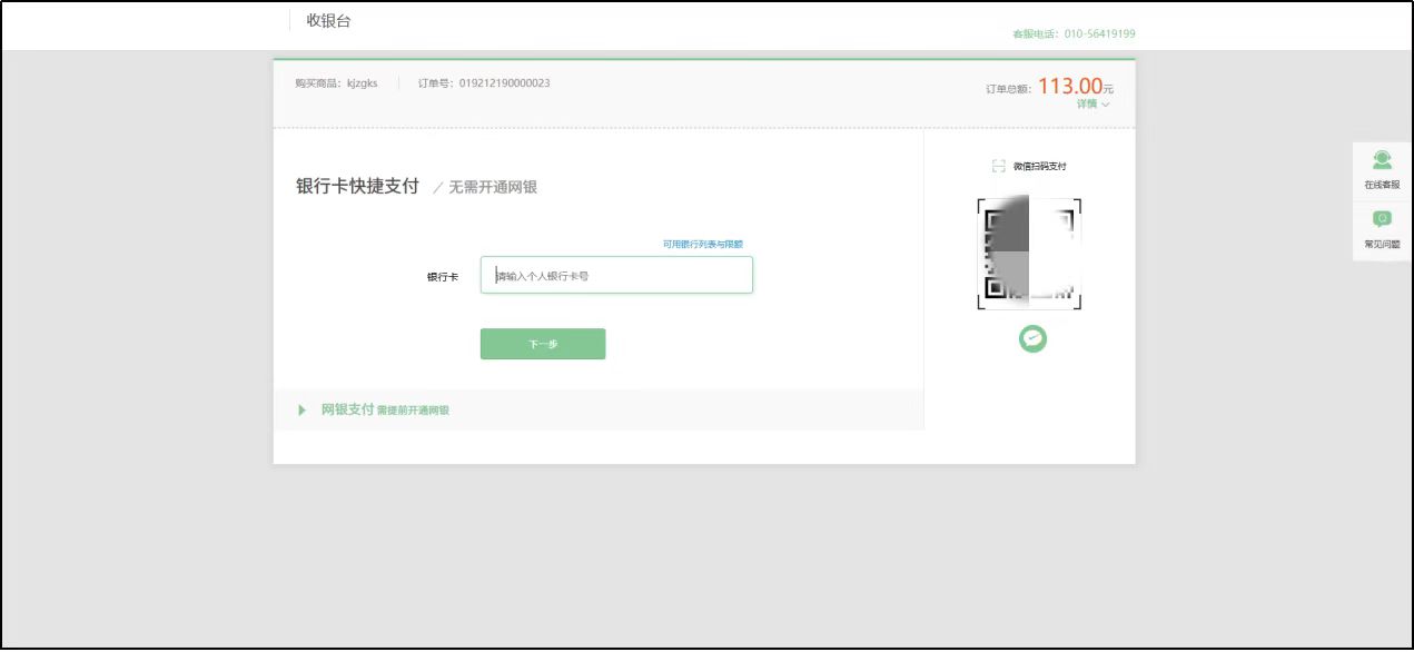 等待審核通過后,重新選擇考試會直接進入到網上繳費的頁面。頁面展示考生報名基本信息、訂單基本信息、支付平臺以及繳費狀態(tài)信息。如下圖所示: