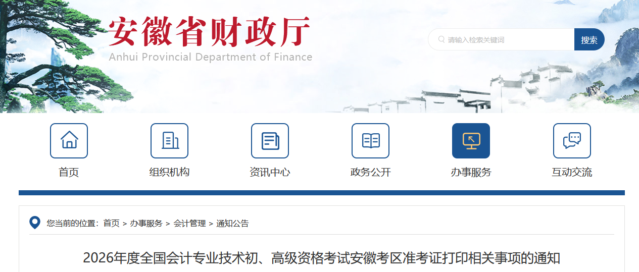 2026年度全國會計專業(yè)技術初、高級資格考試安徽考區(qū)準考證打印相關事項的通知