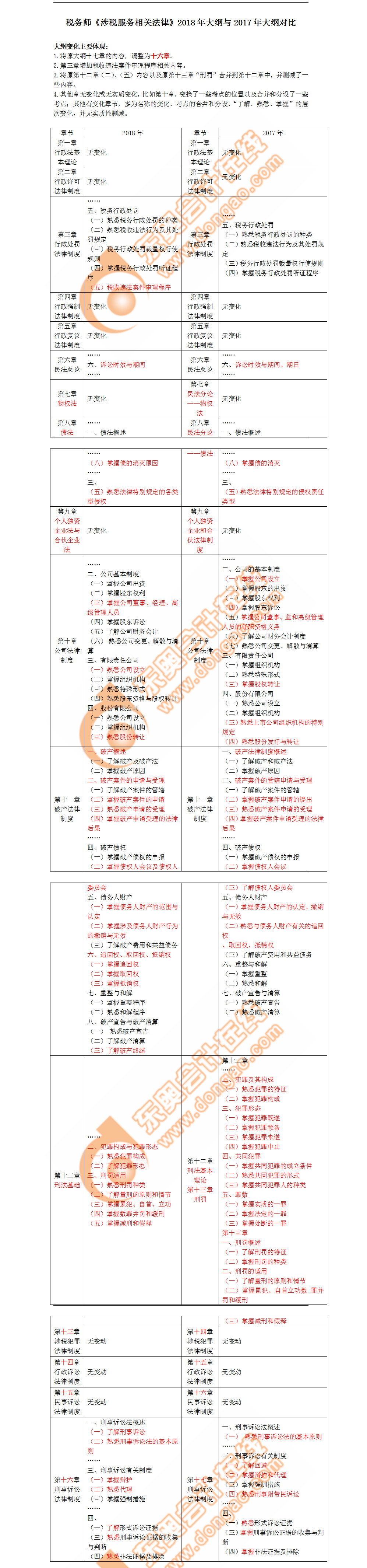 相對來說,《涉稅服務(wù)相關(guān)法律》需要記憶的東西比較多,因此,考生們更要好好把握考試大綱的精髓,將變化的地方重點(diǎn)記憶。更多學(xué)科考試大綱變化對比分析,請參考2018稅務(wù)師新舊考試大綱變化分析匯總。