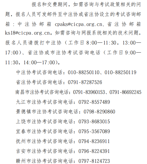 報(bào)名和交費(fèi)期間,如需咨詢(xún)與網(wǎng)報(bào)系統(tǒng)相關(guān)的技術(shù)問(wèn)題,報(bào)名人員請(qǐng)撥打中注協(xié)考試咨詢(xún)電話(huà)010-88250110和010-88250119(工作日8:00-11:30時(shí),13:00-17:00時(shí))或者聯(lián)系各省級(jí)注協(xié)。如需咨詢(xún)與考試政策相關(guān)的問(wèn)題,報(bào)名人員可發(fā)郵件至中注協(xié)設(shè)立的考試咨詢(xún)郵箱cpaks@cicpa.org.cn。