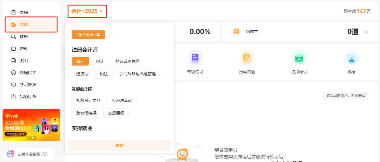 第二步:進入學習中心,點擊「題庫」,選擇對應科目;