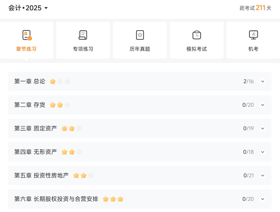 以“章節(jié)練習(xí)”為例,點(diǎn)擊章節(jié)練習(xí)后,選擇章節(jié)開(kāi)始答題。(新考季教材暫未下發(fā),下圖為25考季習(xí)題)