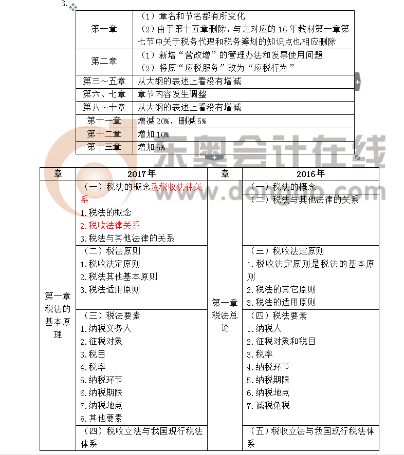 1.刪除16年教材的第四章(營業(yè)稅法)、第十五章(稅務(wù)代理和稅務(wù)籌劃),教材由原來的15章變?yōu)楝F(xiàn)在的13章。
