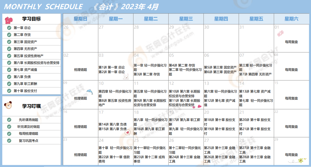 東奧會(huì)計(jì)在線為各位考生整理了4-6月的學(xué)習(xí)計(jì)劃,如下圖所示,計(jì)劃精細(xì)到天,根據(jù)教材重難點(diǎn)合理分配每天的學(xué)習(xí)內(nèi)容??忌梢詤⒖即藢W(xué)習(xí)計(jì)劃,根據(jù)自身情況加以改編,制定更適合自己的備考計(jì)劃。