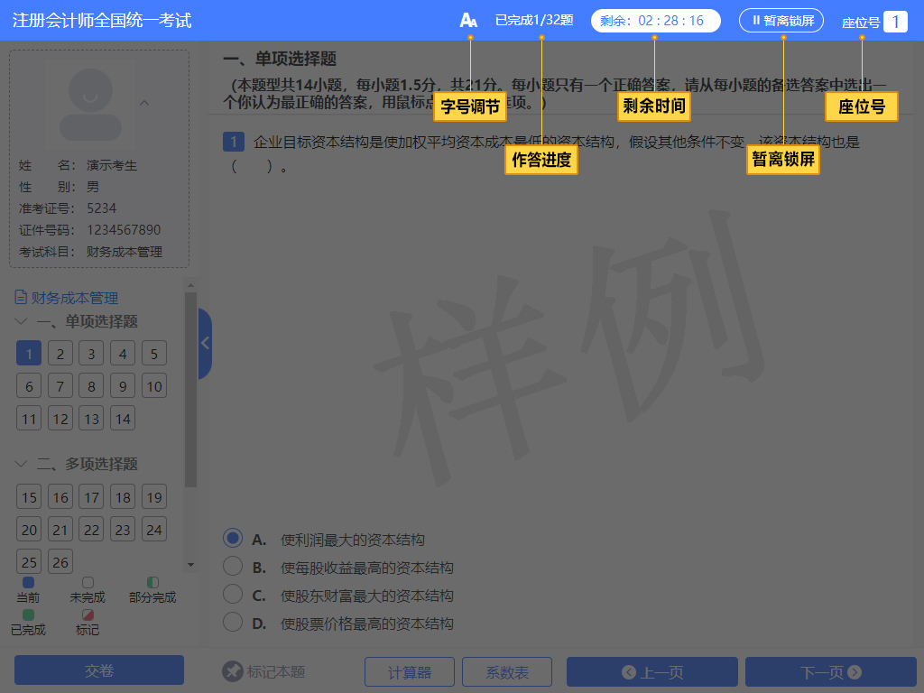 26年注冊會計師考試機考模擬練習(xí)網(wǎng)站已開通,考生可進入系統(tǒng)熟悉布局與操作要點,避免因操作失誤影響發(fā)揮!下文將介紹標(biāo)題區(qū)、試題列表區(qū)、答題區(qū)、工具欄區(qū)四大界面,詳解答題流程及輔助工具的使用方法。此外,正式考試的題型題量、分值分布和機考界面,可能會做適當(dāng)調(diào)整,需要考生額外注意。點擊直達機考模擬練習(xí)網(wǎng)站>>