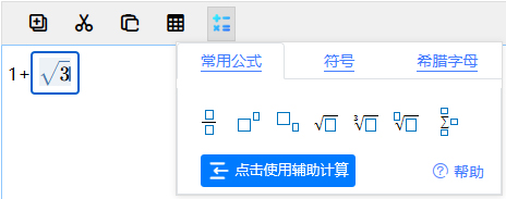 鼠標(biāo)點擊 插入公式符號按鈕公式符號,打開公式編輯菜單,點擊下方的輔助計算按鈕點擊使用輔助計算插入空白公式框后自行編輯公式。完成公式編輯后,在公式框內(nèi)按“=”鍵,系統(tǒng)將自動計算出此公式框的得數(shù)(輔助計算功能僅支持簡易公式的自動計算,不支持帶有字母或錯誤公式的自動計算)。